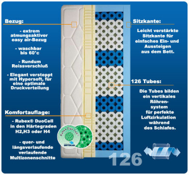 Metzeler-Matratzen atmen, weil Sie auf Rubex Tubes® basieren! Bis zu 200 l Flüssigkeit werden pro Jahr durch die Haut verdunstet und gelangen so in die Matratze. Das Rubex-Tubes®-System leitet die abgegebene Feuchtigkeit spürbar schnell durch die vertikalen Luftkanäle ab. Der Rubex® DuoCell Kern, im Multizonenschnitt über die gesamte Liegefläche, entlastet körperliche Schwerpunkte sinnvoll. Der Jersey-Bezug (41% Baumwolle, 31% Polyamid, 28% Polyester) verfügt über eine Easy Air Klimasteppung und ist mit Hypersoft, einem druckentlastendem Material, versteppt. Er kann dank dem Rundum-Reißverschluss bei 60 Grad in der Waschmaschine gereinigt werden.