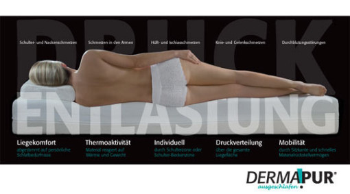 Was muss eine gute Matratze bieten? Sie sollte sich der individuellen Körperkontur anpassen, dem Körper dort Unterstützung bieten, wo sie benötigt wird und so den Belastungsdruck gleichmäßig auf die gesamte Auflagefläche verteilen. Sie sollte noch mehr leisten, nämlich nach der punktuellen Belastung in ihre Ursprungsform zurückkehren. Diese wichtigen Eigenschaften für einen erholsamen Schlaf bieten Produkte von DERMAPUR®.